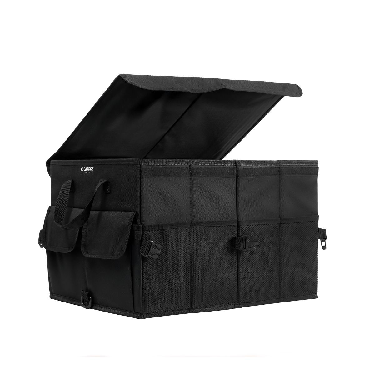 Organizer do bagażnika na rzepy XXL CARDOS można rozłożyć w pełni lub w połowie, dostosowując jego wielkość do aktualnych potrzeb. Wersję pomniejszoną uzyskuje się poprzez spięcie dwóch zatrzasków, co pozwala na jeszcze lepszą organizację przestrzeni w bagażniku.