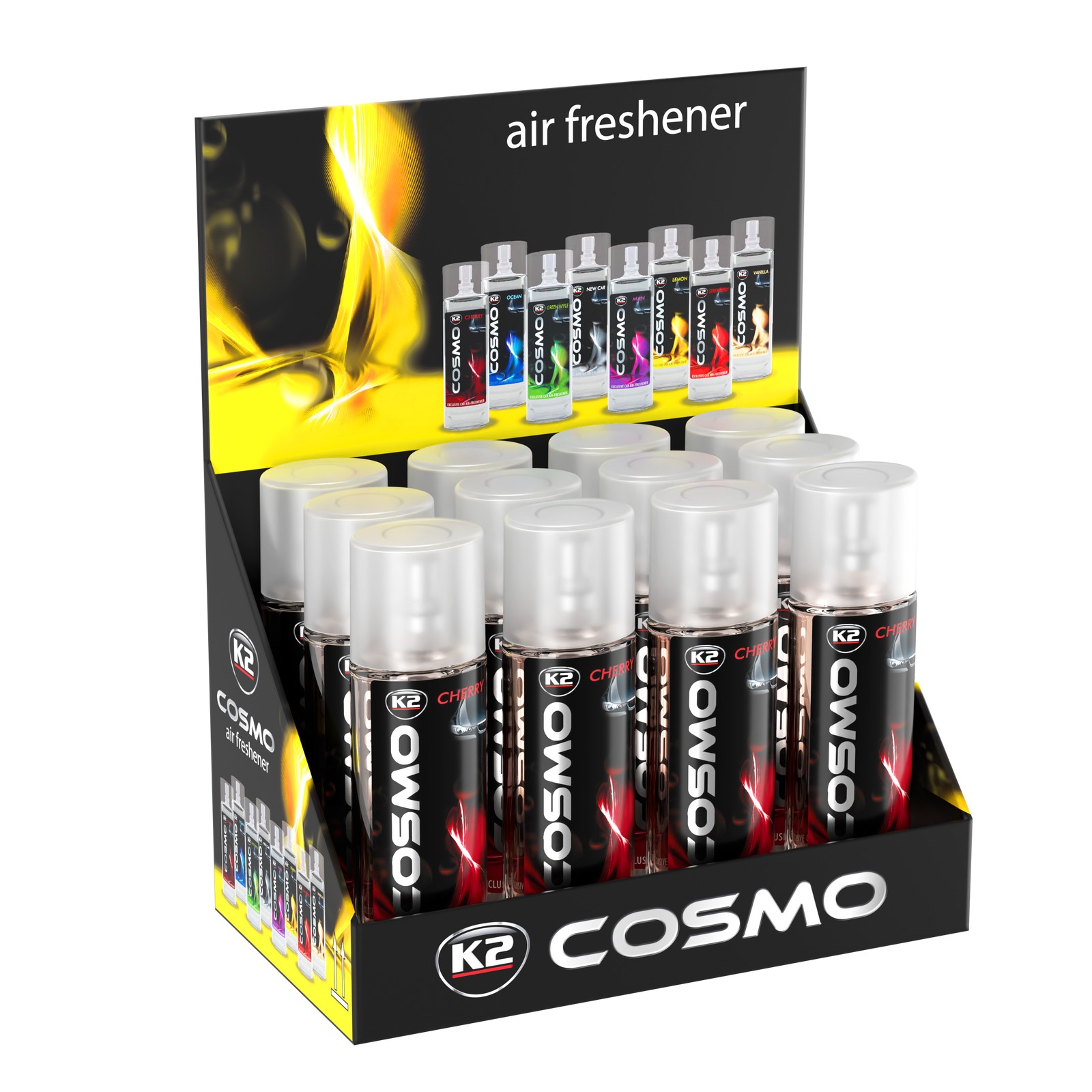 Subtelna kompozycja odświeżaczy K2 COSMO neutralizuje wszelkie niepożądane zapachy. Sposób użycia K2 COSMO pozwala na bezpośrednią aplikację zapachu, przez co możemy nadać wnętrzu niepowtarzalny charakter o wybranej intensywności. Dzięki silnie skoncentrowanej formule K2 COSMO odświeży wnętrze Twojego auta zawsze wtedy, kiedy tego potrzebujesz. K2 COSMO najlepiej rozpylić na miejsca materiałowe, dywaniki samochodowe czy tapicerowane elementy, z których zapach będzie doskonale odparowywał.