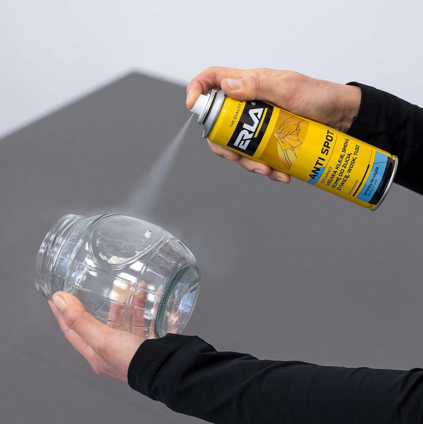 Aby usunąć klej po etykiecie ze słoika, wystarczy spryskać zabrudzone miejsce środkiem ERLA Anti Spot. Po kilku minutach klej odspaja się od szkła i można go łatwo zetrzeć, pozostawiając powierzchnię idealnie czystą.