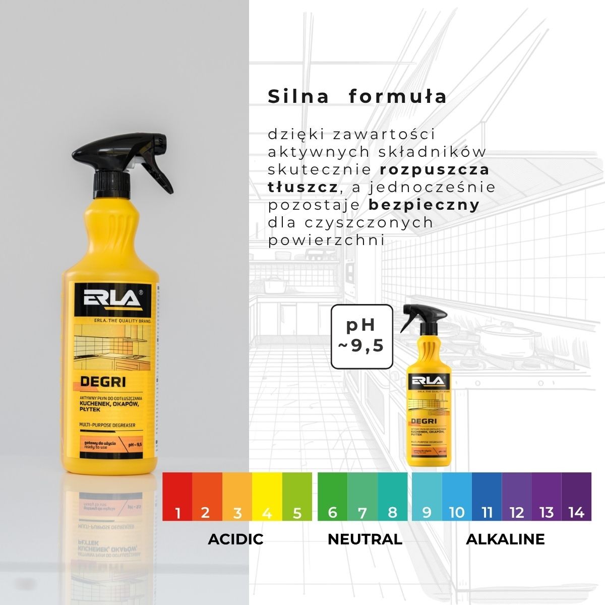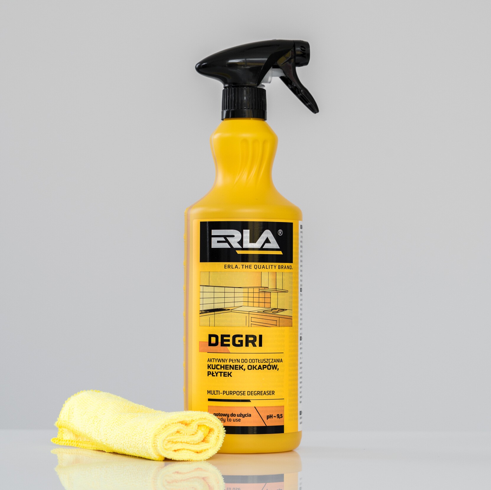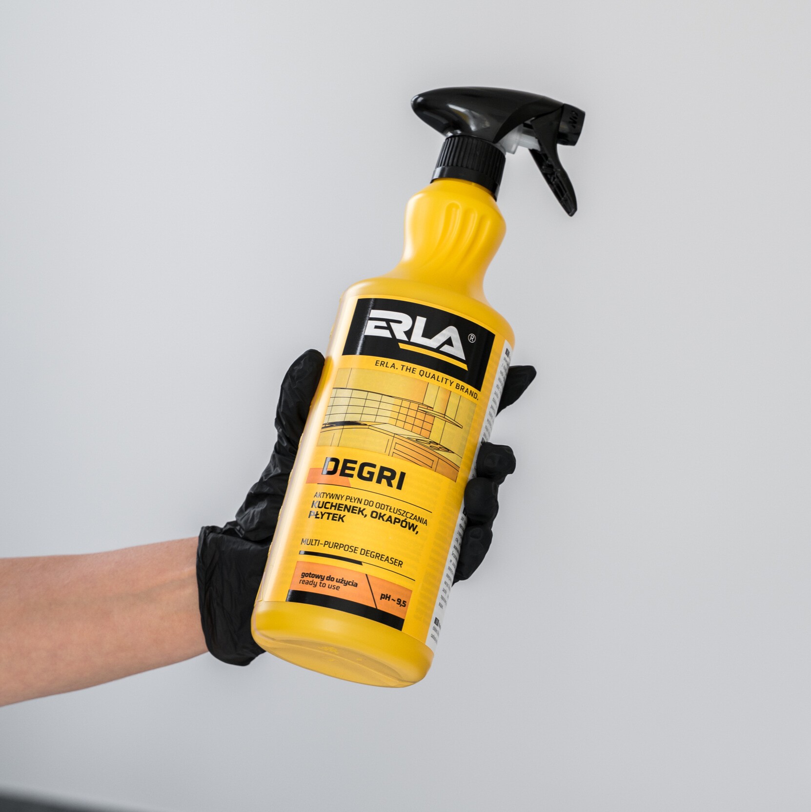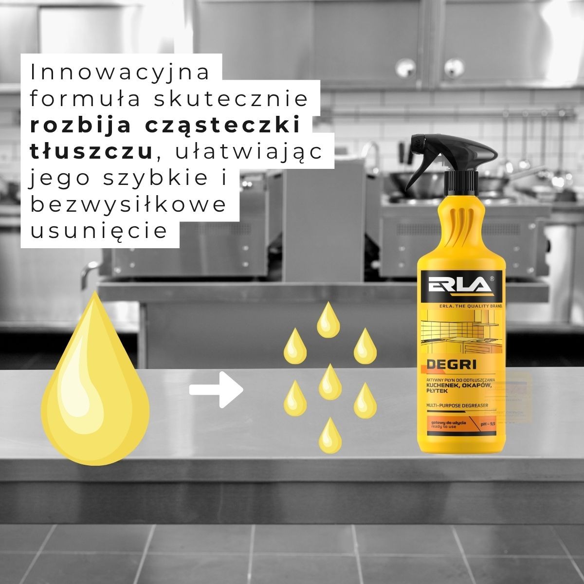 Erla Degri to profesjonalny, gotowy do użycia uniwersalny odtłuszczacz kuchenny. Dzięki zawartości aktywnych składników skutecznie rozpuszcza tłuszcz, a jednocześnie pozostaje bezpieczny dla czyszczonych powierzchni.