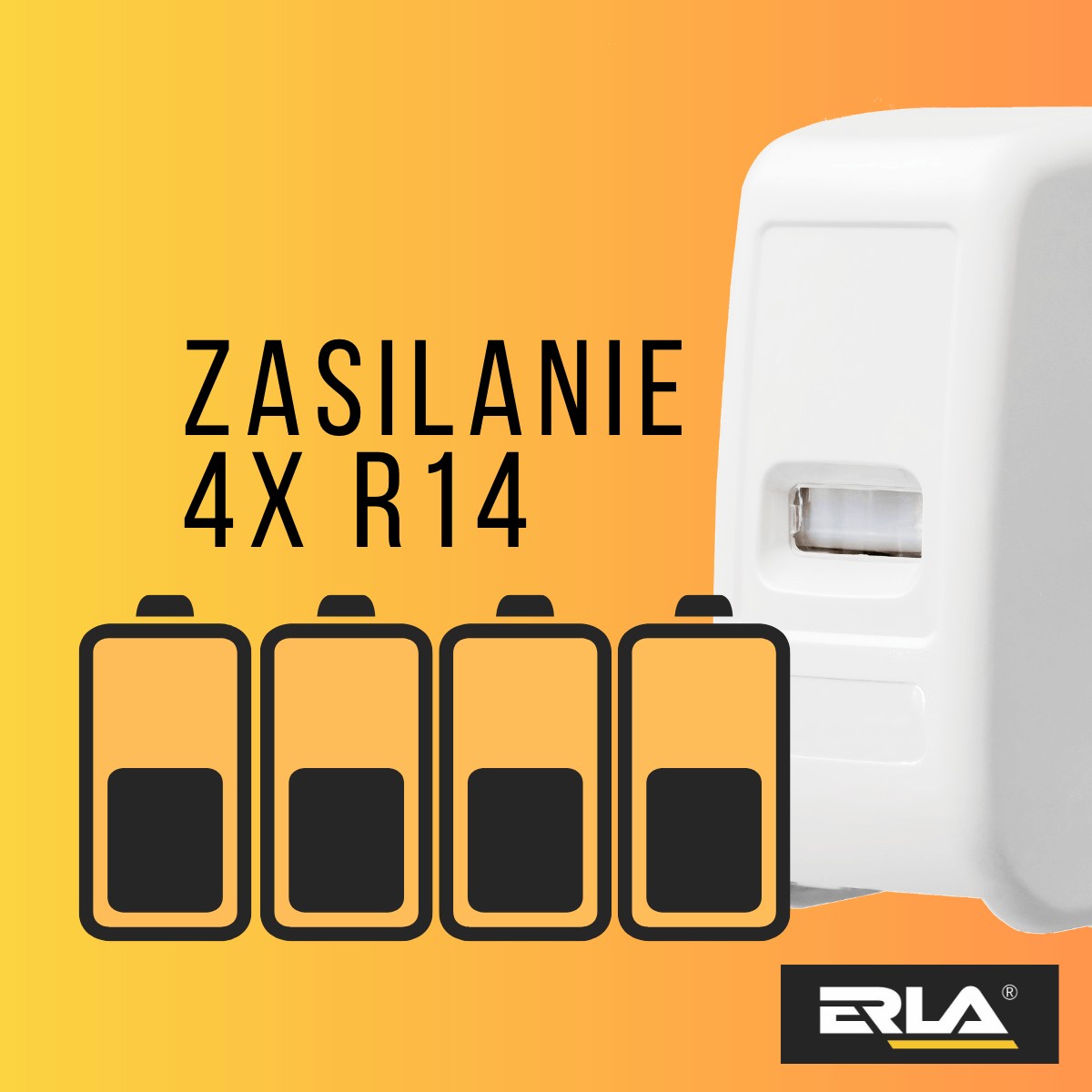 Może być montowany na ścianie za pomocą taśmy montażowej lub wkrętów. Zasilany za pomocą 4 baterii alkalicznych typu R14C.