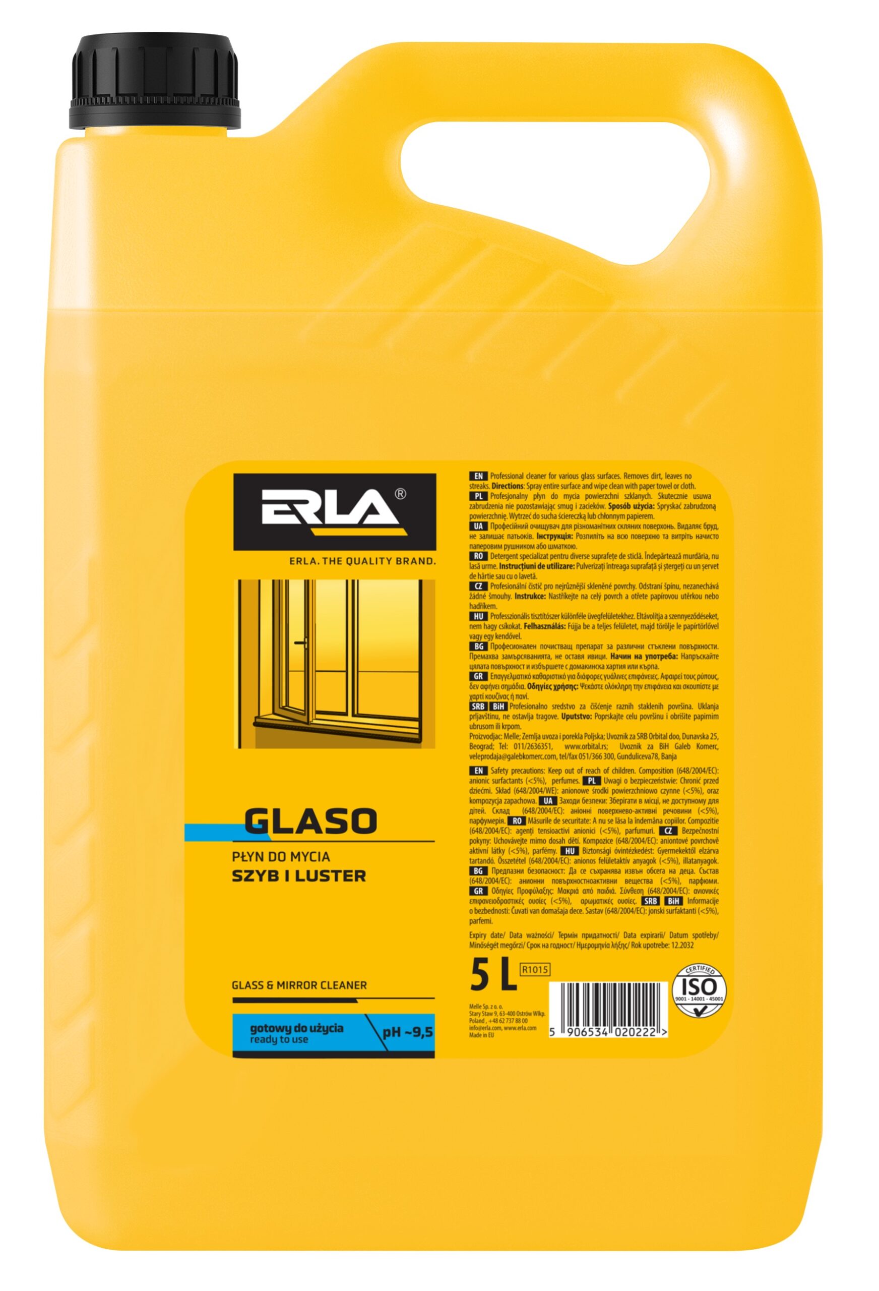 ERLA GLASO 5L to profesjonalny płyn do mycia okien, szyb i powierzchni szklanych w ekonomicznym 5 litrowym opakowaniu. Produkt przeznaczony jest dla firm sprzątających wielkopowierzchniowe obiekty, galerie handlowe, hotele, restauracje, kawiarnie czy biura. Doskonale sprawdzi się jako uzupełnienie mniejszego opakowania GLASO 750ml, zapewniając przy tym niższe koszty jego zakupu.