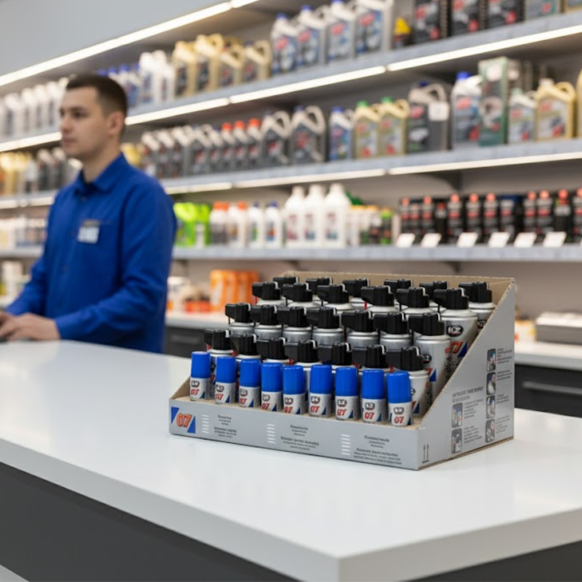 Ekspozytor kartonowy K2 07 to gotowe rozwiązanie sprzedażowe, które pozwala efektownie zaprezentować całą linię kultowego produktu wielozadaniowego K2 07. Zawiera pełen zestaw produktów w różnych pojemnościach – od kompaktowych po profesjonalne duże pojemności – dzięki czemu klient od razu widzi pełnię gamę.