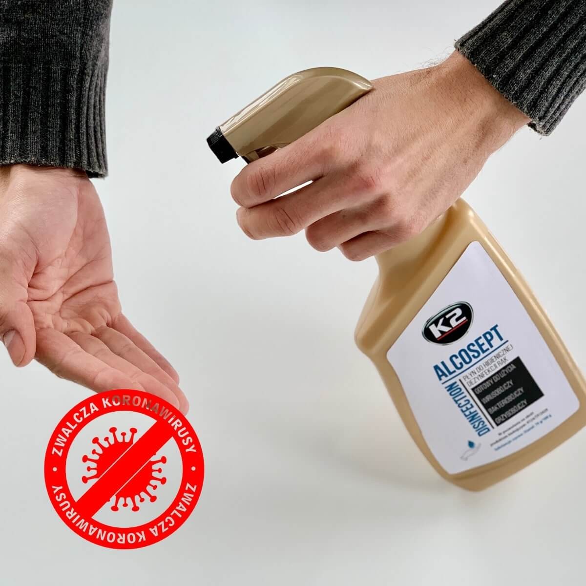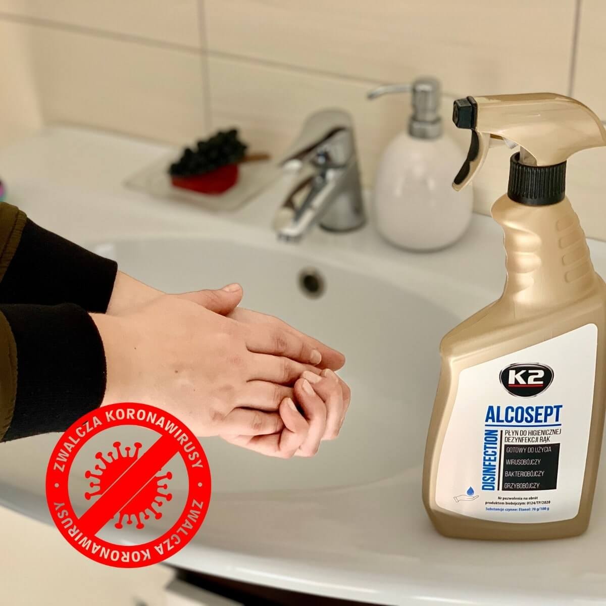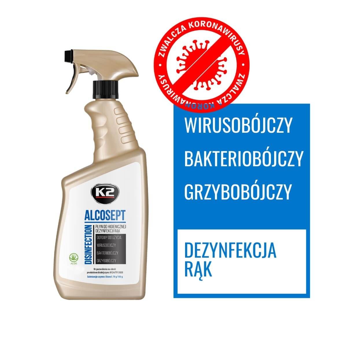 K2 ALCOSEPT jest gotowym do użycia płynem antybakteryjnym na bazie alkoholu, do higienicznej dezynfekcji rąk, o skutecznym działaniu bakteriobójczym, grzybobójczym i wirusobójczym. Stworzony do stosowania w sytuacjach i miejscach wymagających zachowania wysokiego poziomu higieny. Pomaga wszędzie tam, gdzie umycie rąk jest utrudnione. Zabija 99% wirusów i bakterii. Działa skutecznie wobec wirusów osłonkowych – niszczy koronawirusy. Wysycha bez konieczności wcierania, zaraz po roztarciu na dłoniach. Zawiera aloes. Nie wysusza rąk. Może być stosowany do rąk jak i do powierzchni. PRODUKT POLSKI.