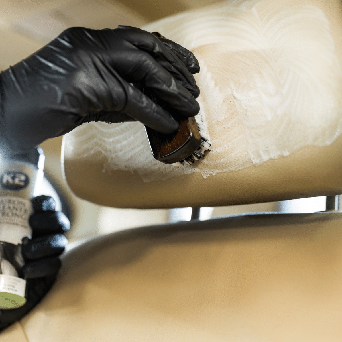 Do czyszczenia skór stosować z produktem K2 Auron Cleaner, w przypadku mocnych zabrudzeń z produktem K2 Auron Cleaner Strong. Do czyszczenia tapicerki materiałowej stosować z produktem K2 Tapis
