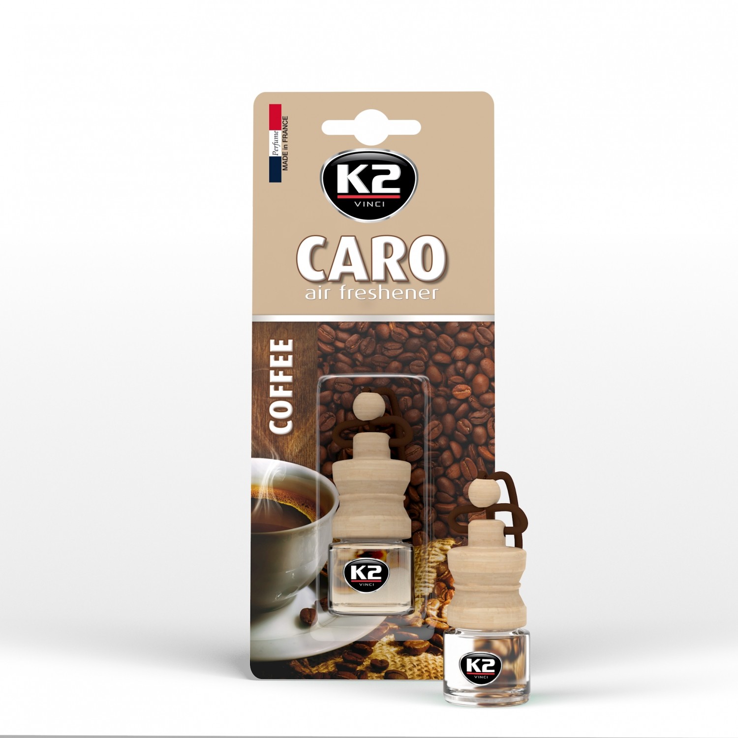 Regulowana zawieszka umożliwia powieszenie w dowolnym miejscu tak, aby unikać kontaktu korka z jakąkolwiek powierzchnią. K2 Caro to wygodny sposób na odświeżenie wnętrza każdego auta i dowolnego pomieszczenia.