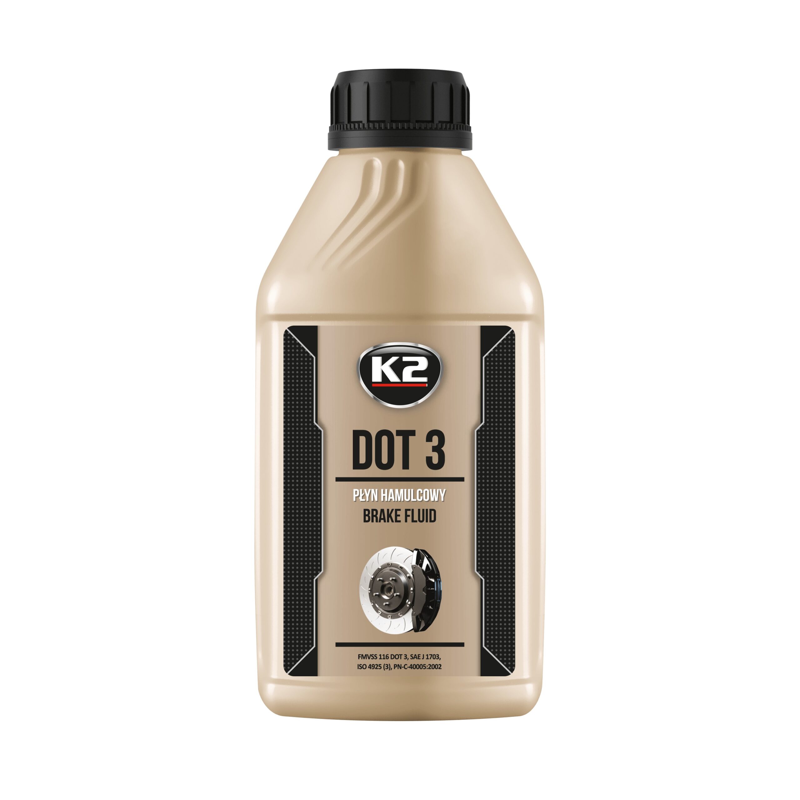 K2 DOT 3 jest to nowoczesny płyn hamulcowy stosowany w układach hamulcowych i sprzęgłowych. Temperatura wrzenia płynu hamulcowego DOT 3 znacznie przekracza wymagalną normami temperaturę 205 C. Zapewnia doskonałą ochronę przed korozją i zabezpiecza elementy gumowe. Wydłuża żytowność układu hamulcowego.