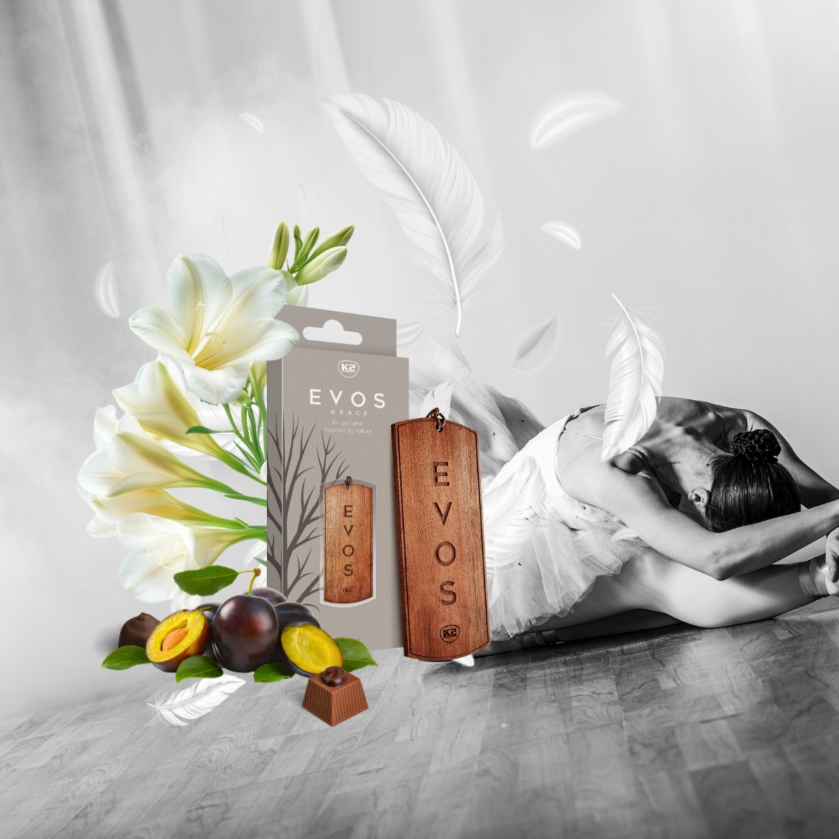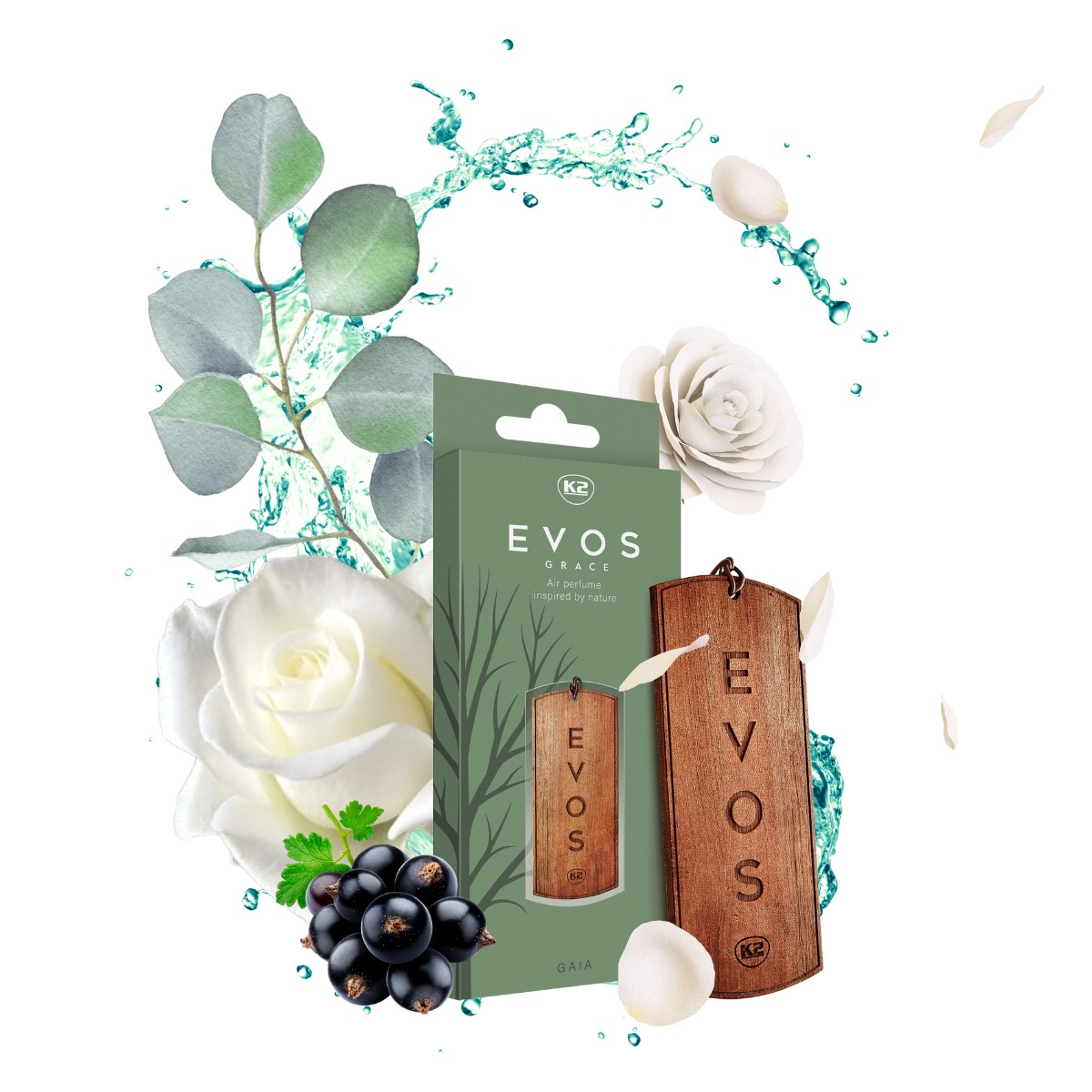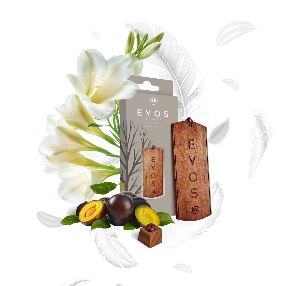 K2 EVOS Grace to inspirowany naturą i nasączony wdziękiem, niezwykły samochodowy odświeżacz powietrza w formie drewnianej zawieszki. Wykonana z litego drewna z dwustronnym grawerem, zdobi wnętrze auta niczym zapachowa biżuteria.