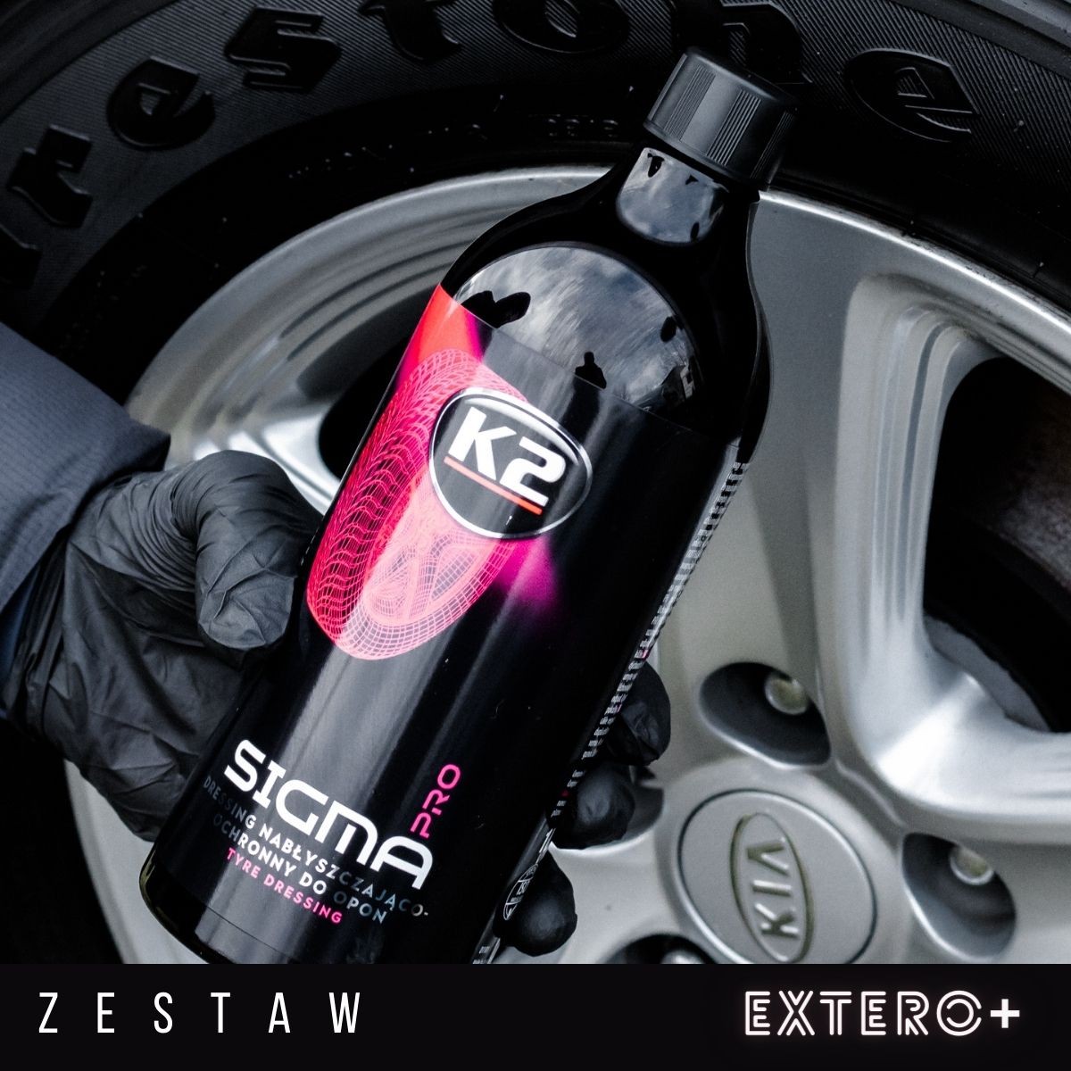 4) K2 Sigma Pro 1L – dressing do opon, który odżywia gumę i nadaje jej głęboki czarny kolor. Efekt mokrej opony? To właśnie jego specjalność. W ten sposób K2 Sigma Pro dopełnia wygląd idealnie czystego auta.