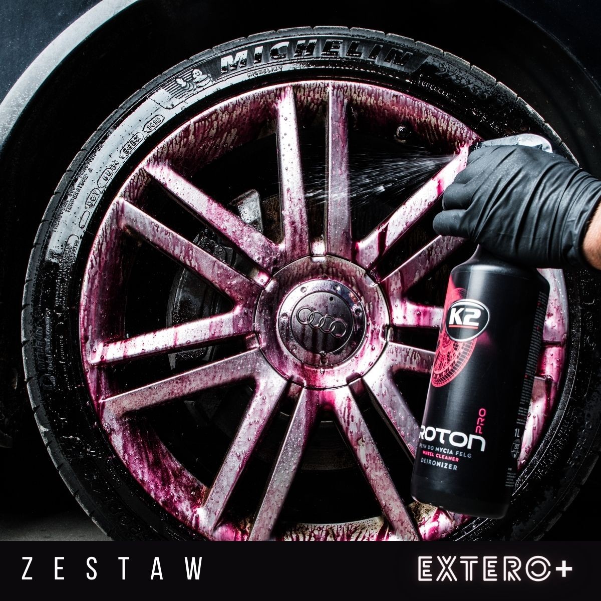 3) K2 Roton Pro 1L – król płynów do mycia felg. Zmywa brud i metaliczne drobiny z powierzchni felgi. Może być używany do oczyszczenia lakieru z metalicznego nalotu. W kontakcie z drobinami metalu barwi się na czerwono, urządzając niezwykle widowiskowy spektakl dla oka. Po użyciu na feldze nie pozostanie na niej żaden brud.