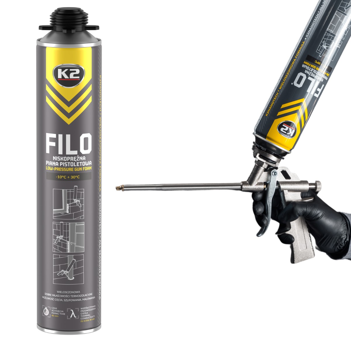Pistolet K2 FOLT przeznaczony jest do aplikacji piany montażowej. Posiada standardowy gwint, dzięki czemu pasuje do wszystkich pian dostępnych na rynku. Specjalnie opracowana konstrukcja dyszy zapewnia równomierny wypływ piany. Ergonomiczna budowa i długi spust gwarantują wygodne i pewne użycie. Pistolet do pianki montażowej K2 FOLT posiada płynną i prostą regulacje ilości piany, a co za tym idzie daje użytkownikowi pełną kontrolę w dozowaniu piany. Wykonany z trwałych materiałów: korpus z aluminium, dysza/pokrętło ze stali powlekanej, iglica/spust stalowe, aplikator -lufa stal kwasoodporna.