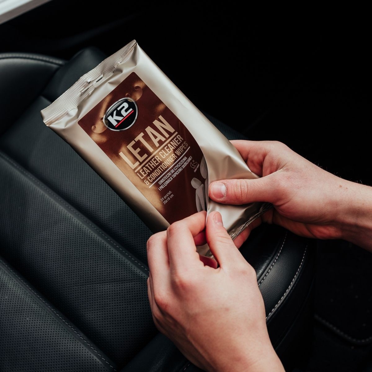 Chusteczki do czyszczenia skóry w samochodzie K2 LETAN WIPES przeznaczone do pielęgnacji tapicerki skórzanej oraz wszelkiego rodzaju elementów wykonanych ze skór gładkich. W szybki i łatwy sposób usuwają zabrudzenia, jednocześnie zabezpieczając oraz impregnując skórę bez efektu śliskiej, tłustej powłoki.