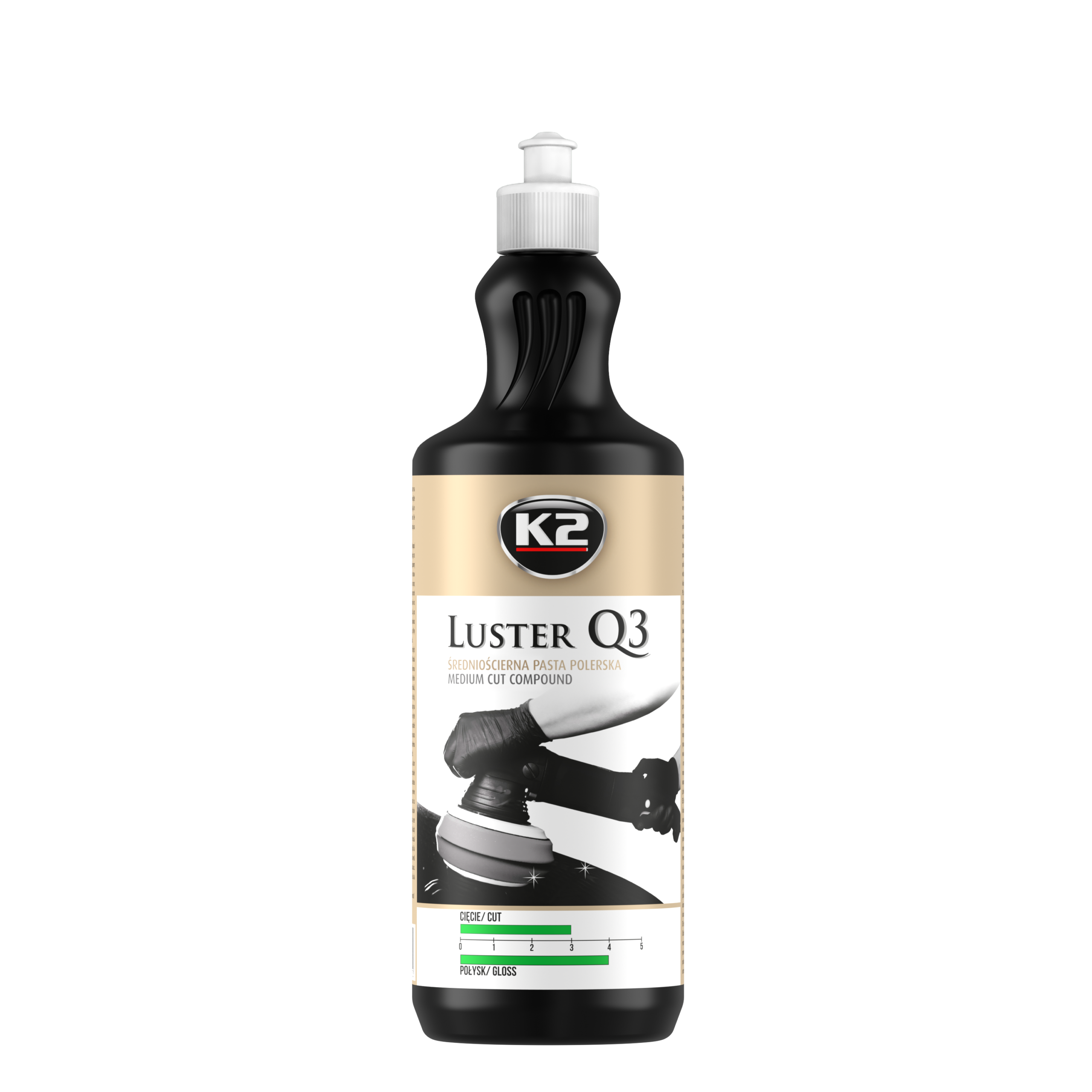 K2 LUSTER Q3 ZIELONY to pasta do maszynowego polerowania lakieru. Usuwa rysy po papierze ściernym, myjniach automatycznych, zmatowienia, skórkę pomarańczową, oksydację, hologramy, przebarwienia. Doskonale nadaje się do polerowanie świeżo nałożonych lakierów oraz do renowacji starych, zniszczonych powłok. Wytwarza mało ciepła podczas pracy, przez co nie przegrzewa powierzchni. Daje doskonałe efekty podczas stosowania w tzw. jednym kroku – tj. 1 cykl polerowania z 1 gąbką. W większości przypadków nie są potrzebne żadne dodatkowe czynności. Przeznaczona do polerowania: lakierów samochodowych wszelkiego rodzaju, lakierów przemysłowych, reflektorów, celulozy, mebli, powierzchni syntetycznych, akryli i wielu innych.