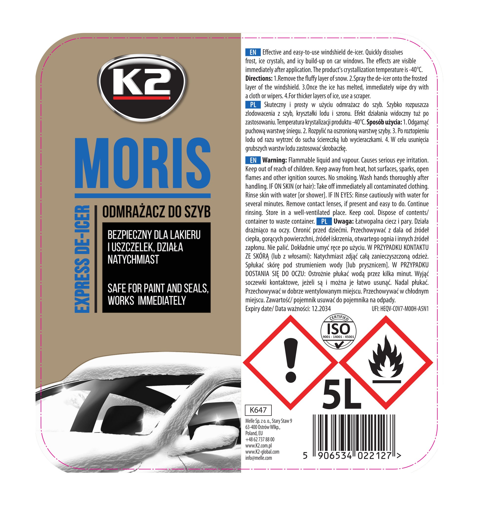 - Działanie do -40°C – Odmrażacz K2 Moris radzi sobie nawet w najniższych temperaturach, skutecznie usuwając lód i szron.