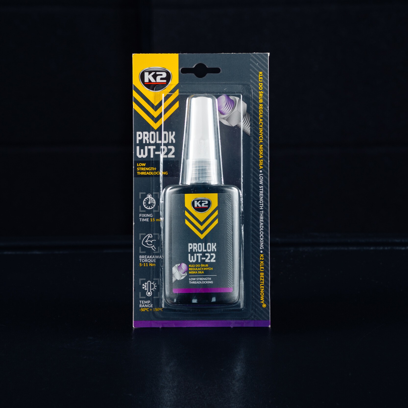 PROLOK WT-22 – K2 KLEJ BEZTLENOWY® o niskiej sile przeznaczony do zabezpieczenia gwintów śrub regulacyjnych, nastawnych w szczególności wykonanych z miękkich metali. Chroni przed korozją, uszczelnia i zapobiega samodkręcaniu. Zastępuje standardowe zabezpieczenia np: podkładki. Nadaje się do stosowania w złączach ze wszystkich rodzajów metali.