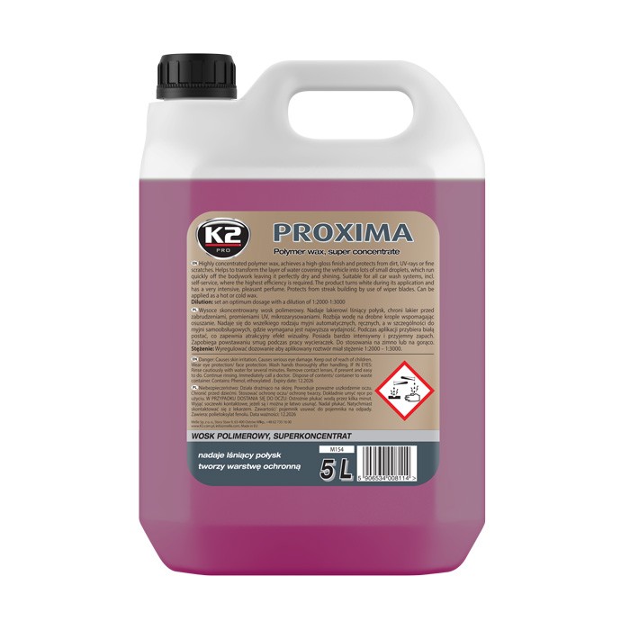 K2 PROXIMA to wysoce skoncentrowany wosk polimerowy. Nadaje lakierowy lśniący połysk, chroni lakier przed zabrudzeniami, promieniami UV, mikrozarysowaniami. Rozbija wodę na drobne krople wspomagając osuszanie. Nadaje się do wszelkiego rodzaju myjni automatycznych, ręcznych a w szczególności do myjni samoobsługowych, gdzie wymagana jest najwyższa wydajność. Podczas aplikacji przybiera białą postać. Co zapewnia atrakcyjny efekt wizualny. Posiada bardzo intensywny i przyjemny zapach. Aromat wyczuwalny jest podczas nanoszenia. Karoseria samochodu po zakończeniu woskowania ma charakterystyczną woń. Zapobiega powstawaniu smug podczas pracy wycieraczek. Do stosowania na zimno lub na gorąco.