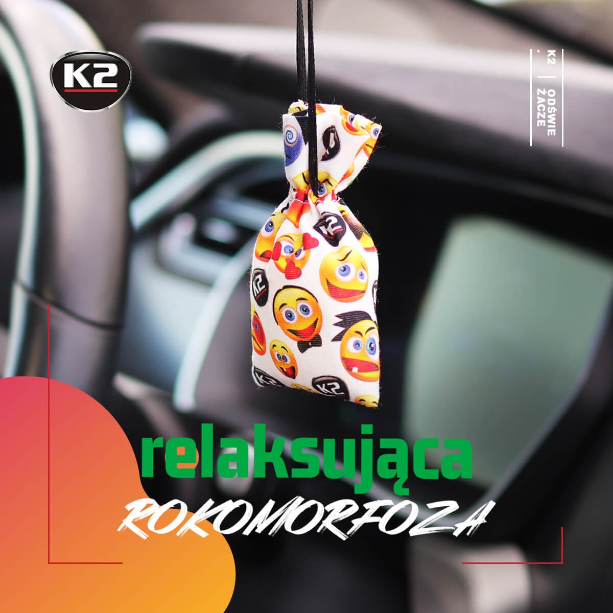 K2 Roko Happy to odświeżacz powietrza w bawełnianym woreczku z zabawną grafiką znanych emotikonek, które nie pozwolą się nudzić w czasie długich wojaży.