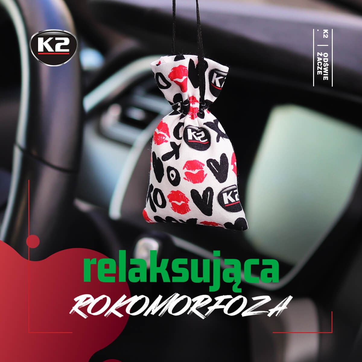 Zapach do samochodu K2 Roko Kiss dzięki swojej formie mogą być stosowane we wszystkich rodzajach