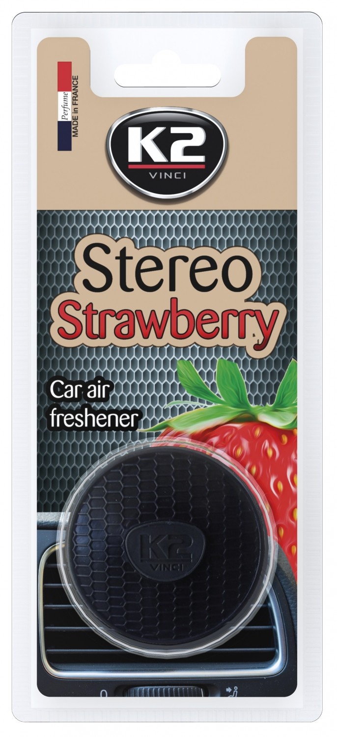 K2 Stereo to zapach do samochodu odświeżacz powietrza w kształcie głośniczka dostępny w 8 popularnych aromatyzacjach: vanilla, green apple, ocean, greem tea, fahren, arctic, strawberry oraz lemon.