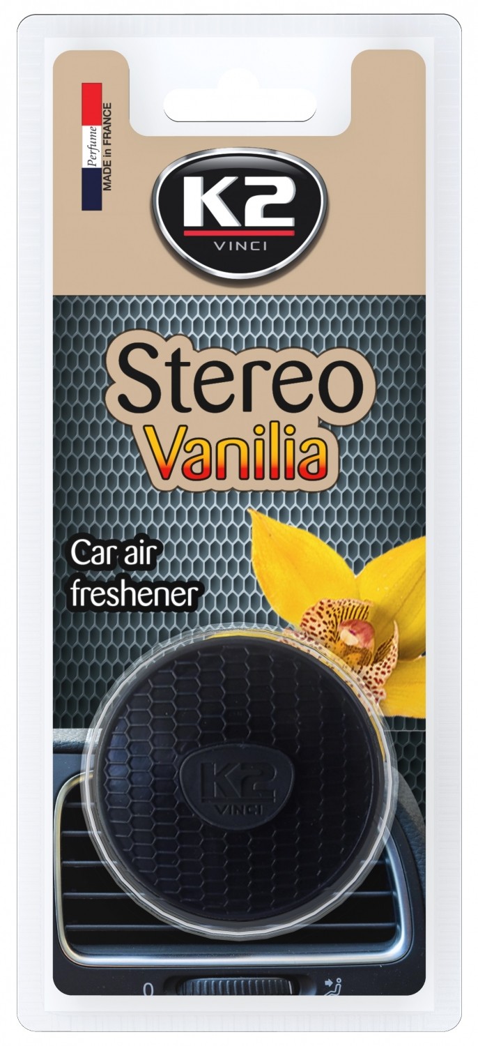 K2 Stereo to zapach do samochodu odświeżacz powietrza w kształcie głośniczka dostępny w 8 popularnych aromatyzacjach: vanilla, green apple, ocean, greem tea, fahren, arctic, strawberry oraz lemon.