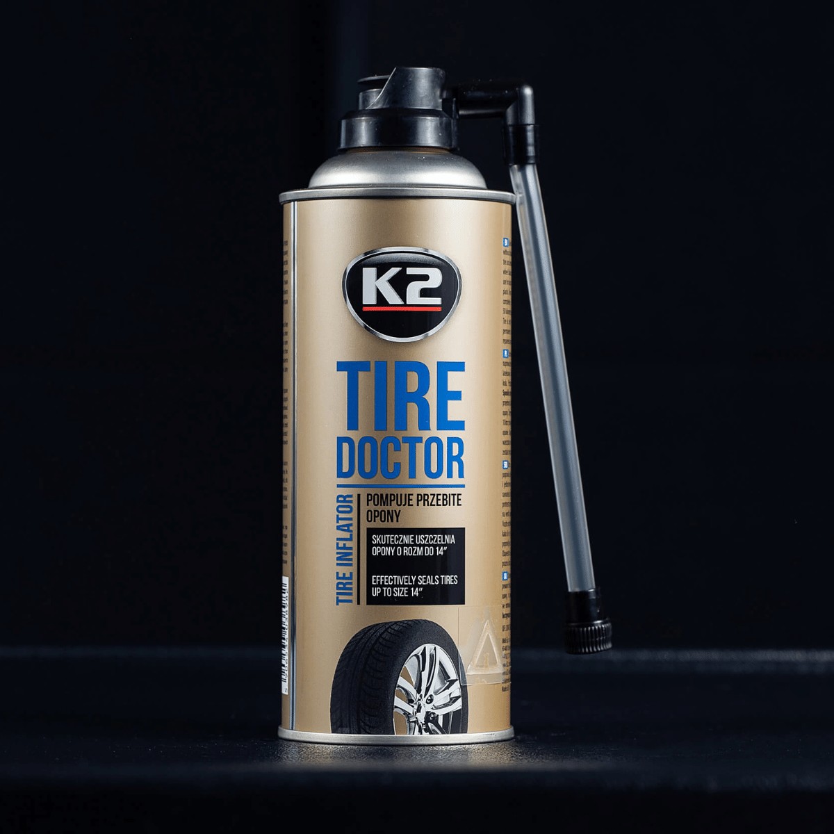 K2 Tire Doktor to koło zapasowe w sprayu które szybko i skutecznie pompuje i uszczelnia przebite opony – tymczasowa naprawa bez demontażu i użycia narzędzi. Aerozol pompuje oponę, a specjalna lateksowa formuła uszczelnia dziurę. Preparat nie wpływa na wyważenie koła. Pompuje opony do rozmiaru 14″.