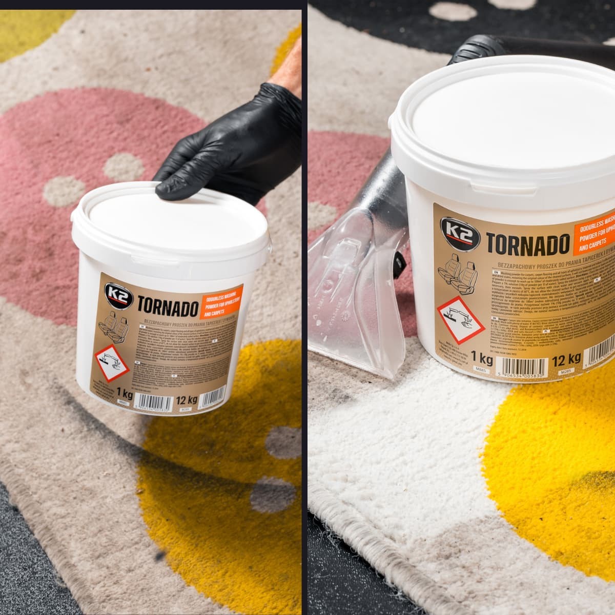 K2 Tornado to niskopienny, bezzapachowy proszek do prania tapicerki samochodowej, meblowej, wykładzin tekstylnych i dywanów. Skoncentrowany, wyjątkowo wydajny i bardzo ekonomiczny. Stworzony do stosowania z piorącymi odkurzaczami ekstrakcyjnymi, z którymi zapewnia najlepszy efekt czyszczenia.