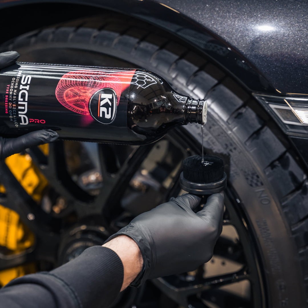 Regularne stosowanie dressingu do opon np. K2 Sigma z użyciem aplikatora K2 TRACO PRO zabezpiecza gumę przed szkodliwym wpływem czynników zewnętrznych, takich jak promieniowanie UV, brud czy sól drogowa.