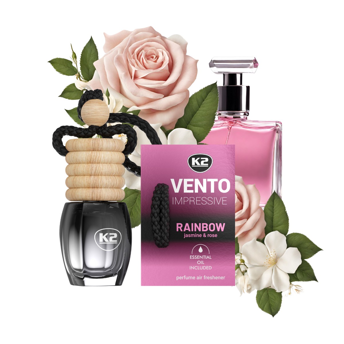 Perfumowane kompozycje zapachowe K2 Vento Impressive błyszczą zapachem niczym samochodowa biżuteria, a odświeżacz zdobi wnętrze auta.