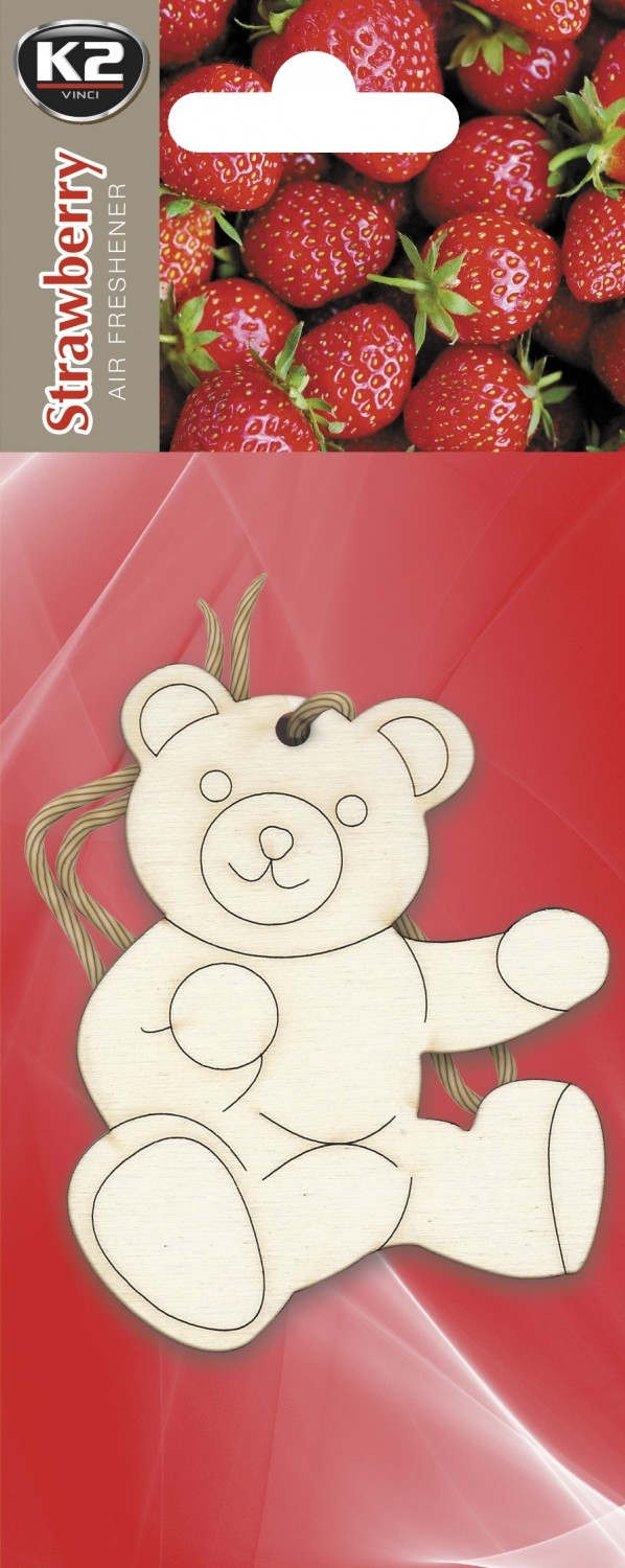 Samochodowy odświeżacz powietrza w formie drewnianej zawieszki w kształcie zabawnego misia. Nasączone aromatem drewno stopniowo uwalnia przyjemną woń do wnętrza auta. Zmysł powonienia łechce soczysta truskawka.