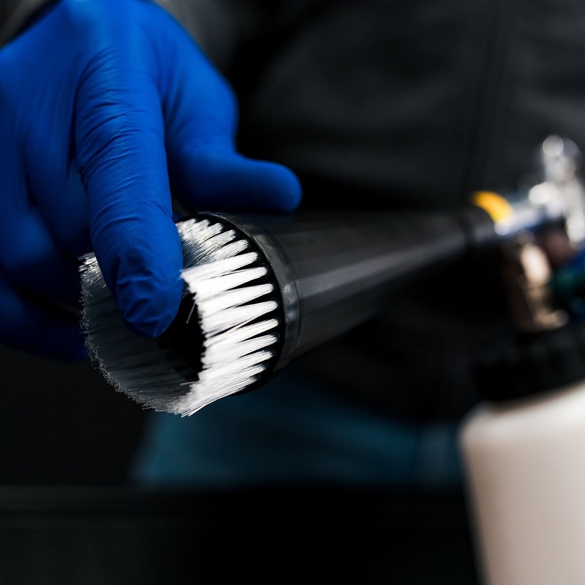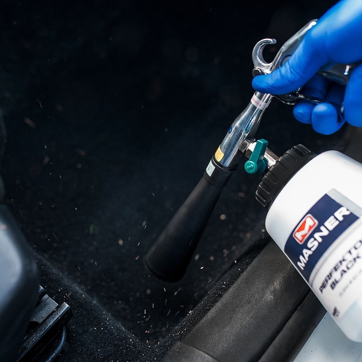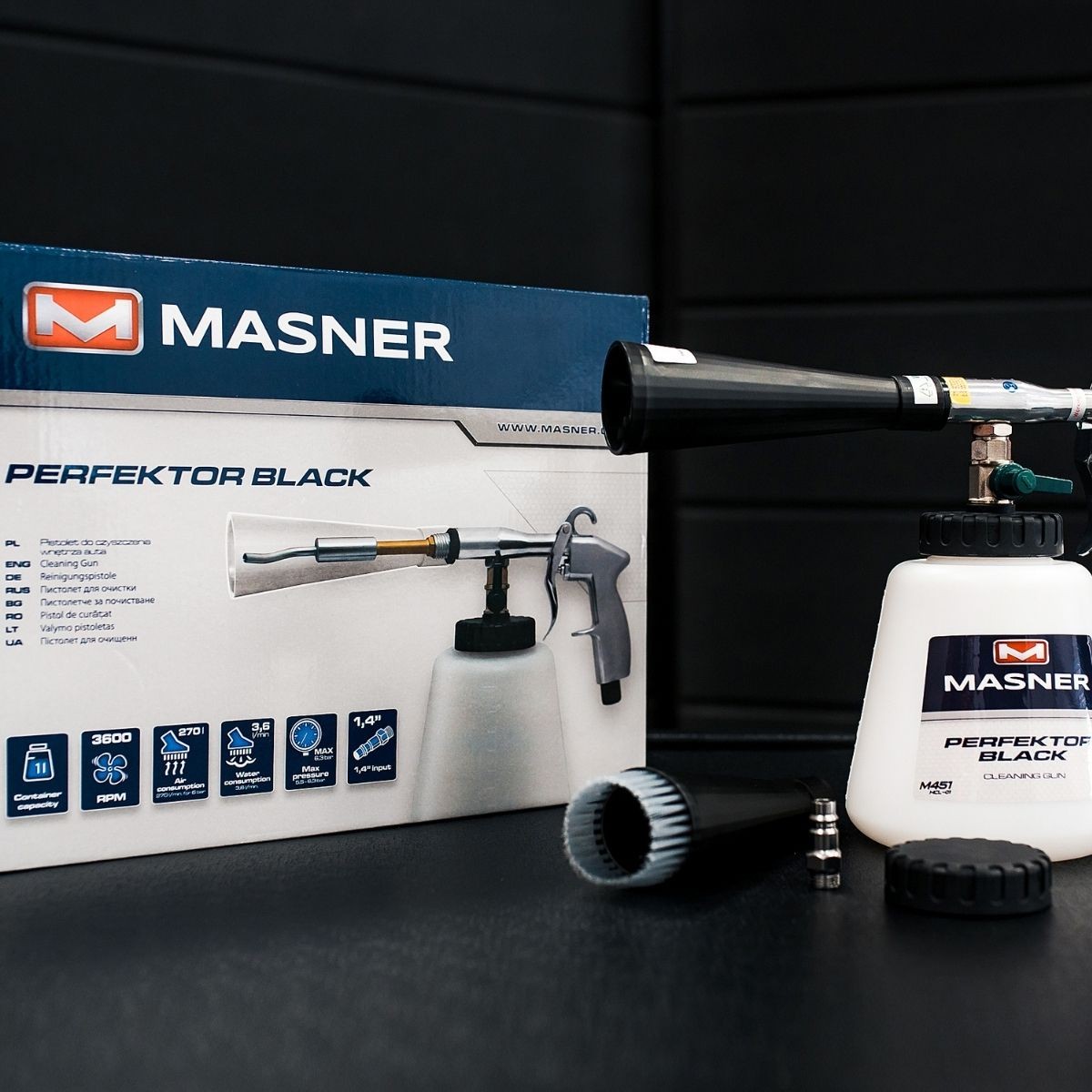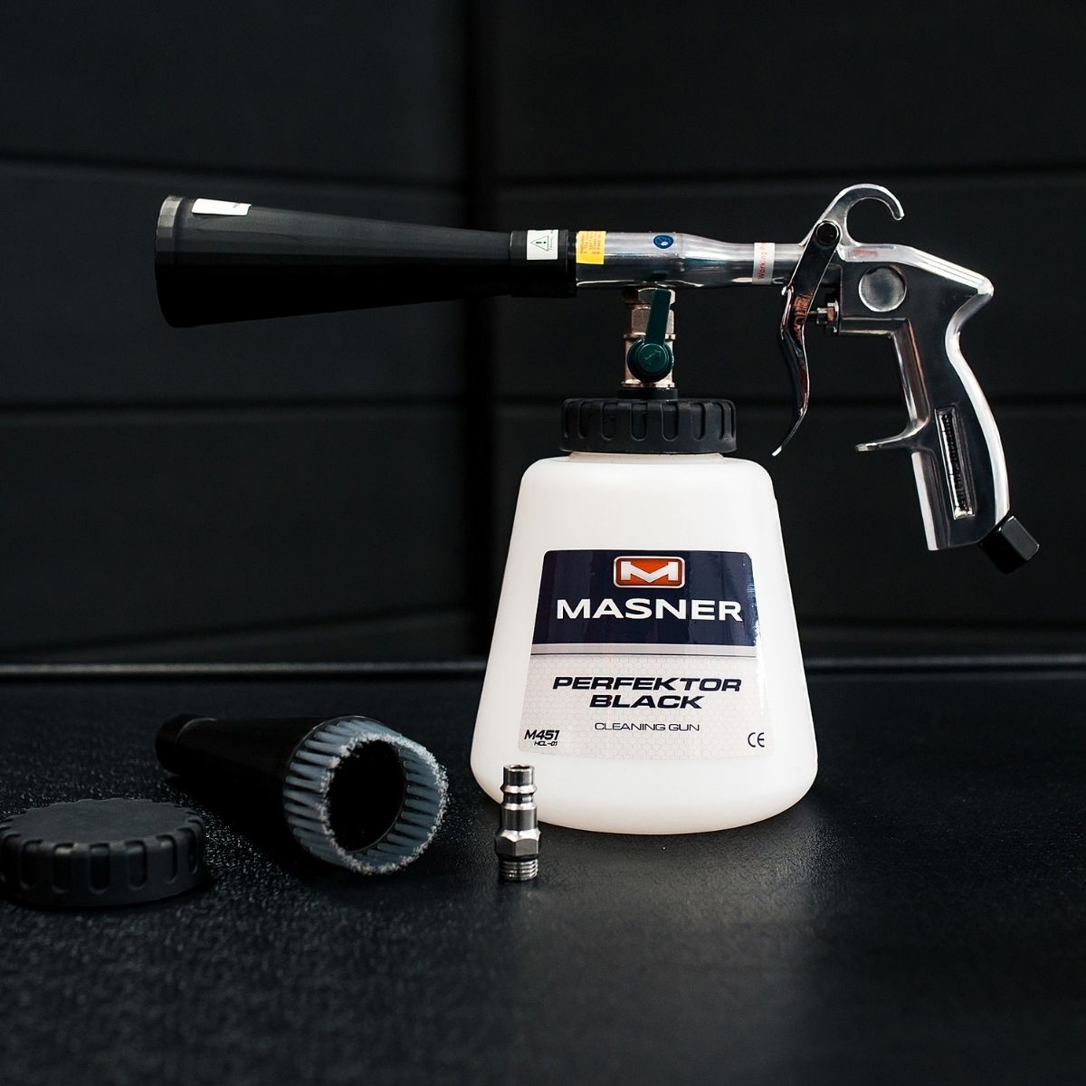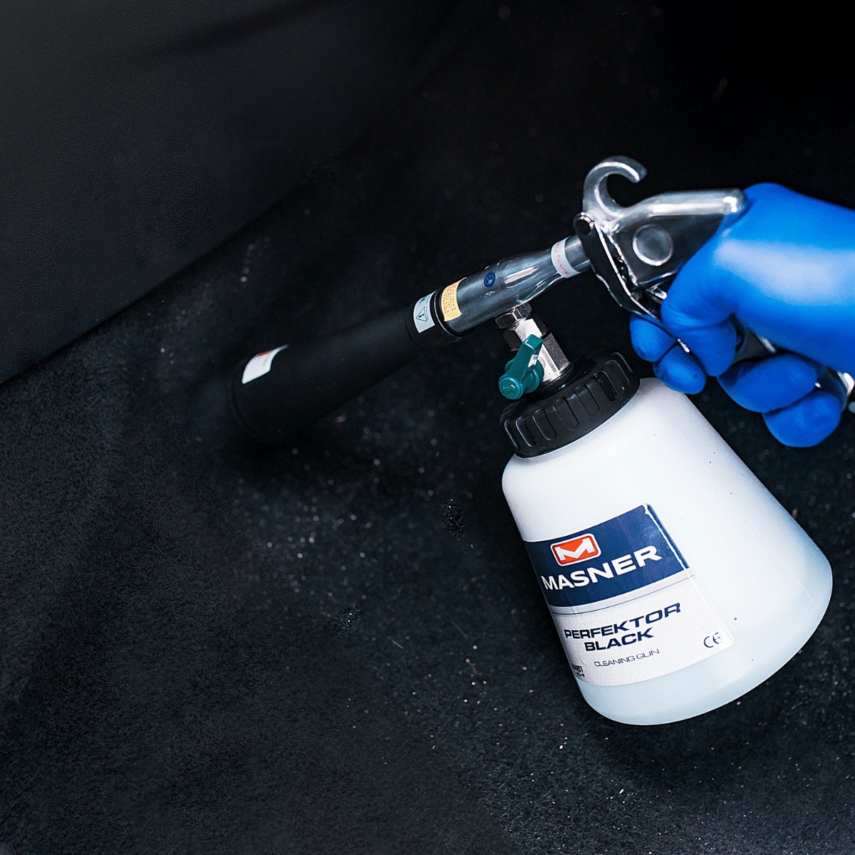 Udoskonalona wersja sprawdzonego urządzenia PERFEKTOR BLACK. Standardowy wężyk czyszczący wewnątrz tuby został zastąpiony dyszą na łożysku, dzięki czemu urządzenie jest jeszcze bardziej skuteczne i trwałe. Pistolet PERFEKTOR BLACK przeznaczony jest do czyszczenia na mokro wszelkiego rodzaju zabrudzeń tapicerki, karoserii, elementów z tworzywa sztucznego, nawiewów powietrza, dywaników, oraz innych trudno dostępnych miejsc. Jest w całości wykonany z metalu, dzięki czemu jest odporny na wszelkiego rodzaju uszkodzenia mechaniczne. Jego ergonomiczny kształt ułatwia pracę i redukuje zmęczenie ręki. Wyposażony jest w duży, litrowy zbiornik na płyn czyszczący. Zamontowana w pistolecie dysza wytwarza pod wpływem sprężonego powietrza spieniony roztwór czyszczący. Piana jest nanoszona na element pod wysokim ciśnieniem, dzięki czemu czyszczenie jest bardzo skuteczne. Posiada płynną regulację przepływu powietrza oraz ilości pobieranego płynu.