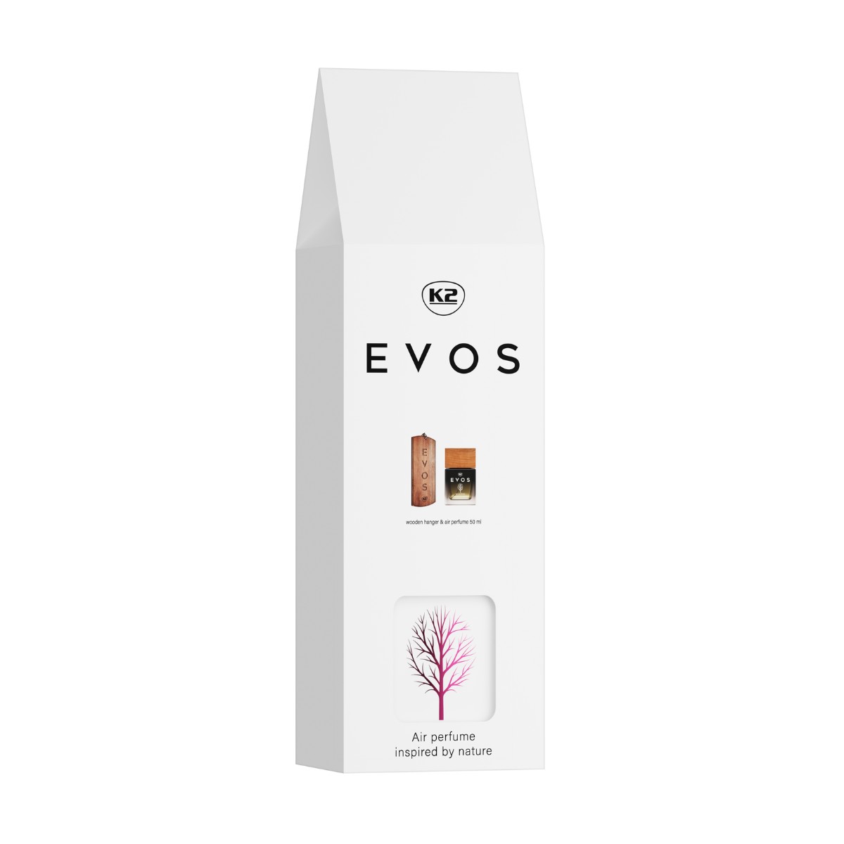 Zestaw zawiera: 1 szt. drewnianej zawieszki zapachowej, 1 flakon perfum K2 Evos 50 ml